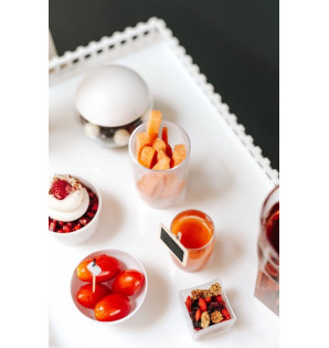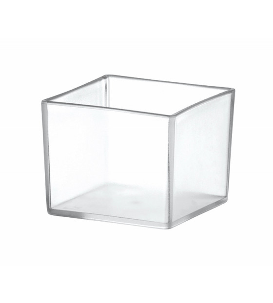 Vasito cuadrado transparente esmerilado de 3 cl. Puede utilizarse con el vasito Kubo blanco nacarado VKB3NA para acentuar el aspecto geométrico de sus presentaciones.