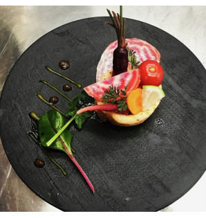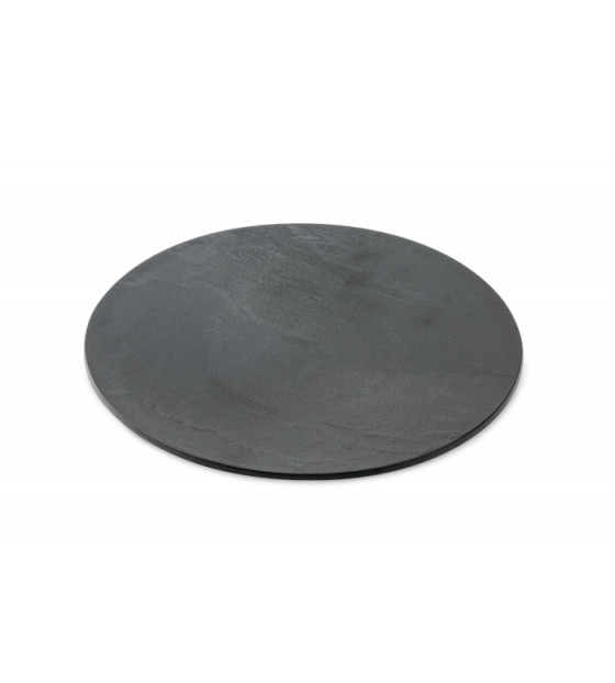 Plato redondo negro, con textura efecto pizarra. Ligeramente curvado, es de muy alta calidad. De PS, es lavable, reutilizable y reciclable. La gama se compone de 3 platos: - Ø130 ATN13, tapa C13TX -180x130 ATN18, tapa C18TX - Ø220 ATN22, tapa C22TX