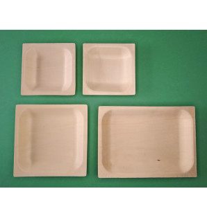 Platos Cubik Madera fabricados con una fina lámina de madera que aporta un aspecto natural y auténtico a sus soluciones de menús. Se pueden calentar en el microondas o en el horno, estos platos están adaptados a todas nuestras bandejas para comida Thema. Los kits versión B, KITBB y KITBBSC, con o sin tapas de rPET (alt. 30 mm) se componen de: - 1 plato 180x130x alt. 15 mm ACB18, tapa ACC18 - 2 platos 130x130x alt. 15mm ACB13, tapa ACC13