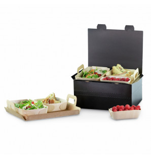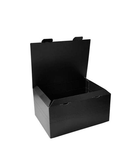 Producto que se entrega plano, se le da forma rápidamente gracias a un fondo automático y su tapa unida. Perfecto para la entrega de un menú para dos.