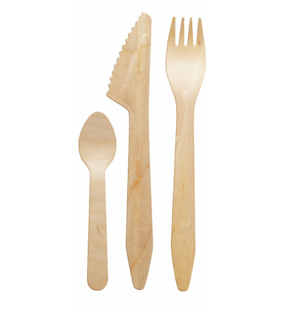 Cubiertos Madera en kit 4/1 presentado en bolsita kraft con: tenedor, cuchillo, cucharilla y servilleta blanca.
