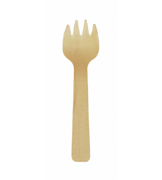 Mini tenedor/cuchara de madera. Este cubierto 2 en 1 es ideal para degustar vasitos salados y dulces o patatas fritas servidas en cucurucho. También disponible en paquetes grandes (2500 u.) XMFC105