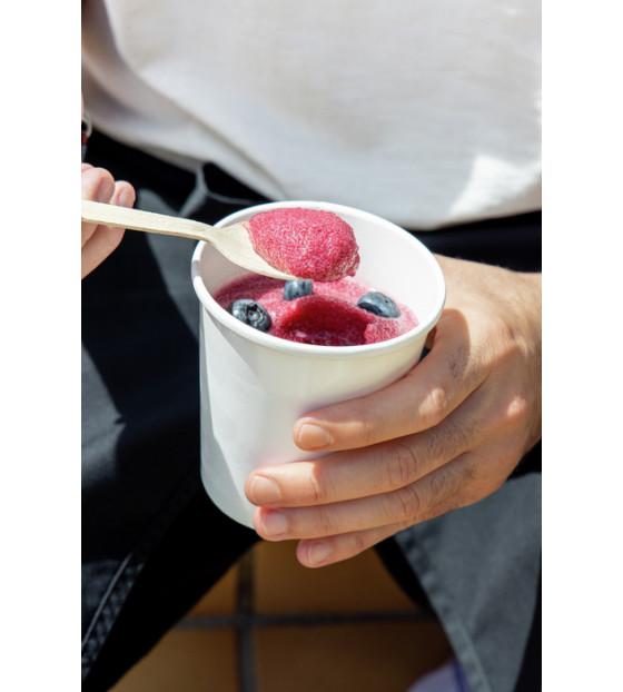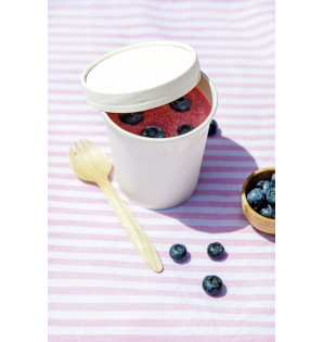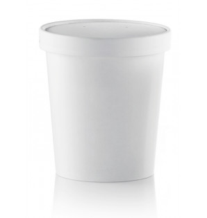 Conjunto tarro de 35 cl y su tapa de cartón blanco, ideal para comida para llevar. Diseñado para llenarlo en caliente y servirlo en el plazo de una hora (líquido hasta 100 °C), es resistente a la grasa. También está disponible en 35 cl PS355.