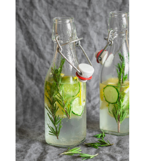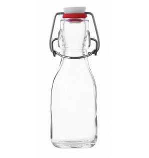 Mini botella de limonada de vidrio de12 cl, con su tapón tradicional unido y su junta de goma naranja. Fácil de transportar y estética en una mesa de recepción, es una forma divertida de presentar bebidas, con una pajita como accesorio. Reutilizable y reciclable.