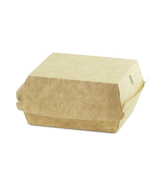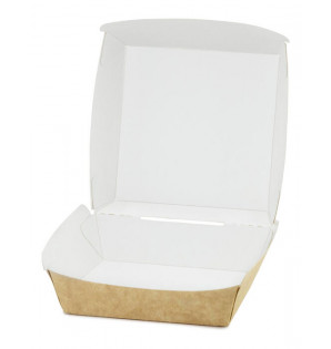 Caja Burger de cartón kraft con revestimiento interior blanco.