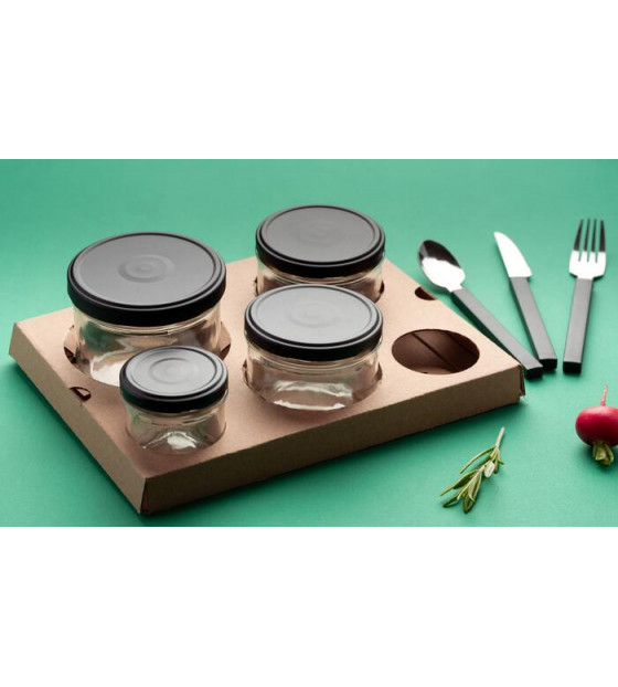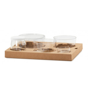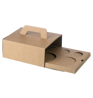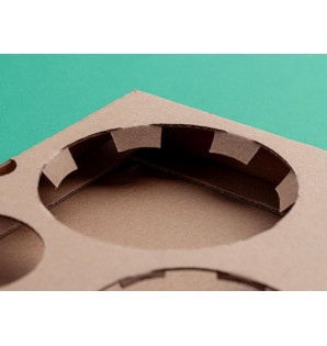 Calce versátil de cartón con 5 huecos preperforados y ajustables ±15 mm: x2 Ø82-97 mm x1 Ø68-83 mm x1 Ø47-62 mm x1 ubicación Ø55 mm para un vaso de cartón 10 cl GCE10 o un vaso Comptoir: XGV016, CPS16.
