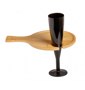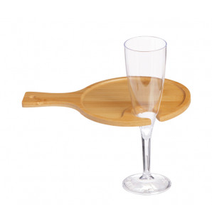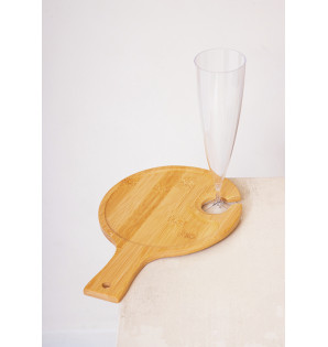 Plato de cóctel portavasos redondo, de bambú de calidad prémium. El hueco (100 mm, Ø30 mm) permite colocar una copa o una copa flauta (FLC15, FC13PPN). La superficie restante se utiliza para colocar algunos bocaditos o pinchos de aperitivo. Fácil de transportar gracias a su mango de 70 mm, es perfecto para eventos nocturnos, recepciones o aperitivos-cena. Lavable y reutilizable.
