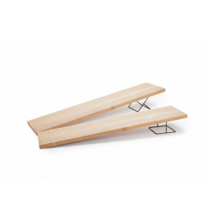 Soporte pequeño negro de metal antideslizante, para utilizar como caballete, plano (alt. 70 mm) o inclinado (alt. 120 mm). Las tablas de madera maciza pueden disponerse como estantes o como superficie inclinada, PBK800, PBP800, PBA600 Fabricado artesanalmente en Francia, el soporte es reutilizable.