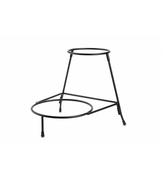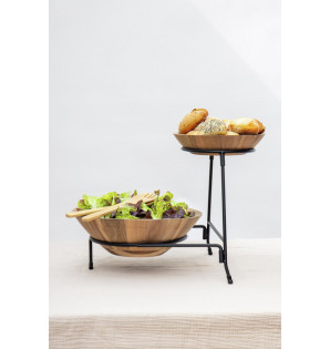Soporte de metal negro adaptado a nuestras 2 ensaladeras Acacia SA230 y SA330: el modelo pequeño se coloca en la parte superior Ø170 mm y el grande en la parte inferior Ø230 mm. El expositor es estable gracias a sus pies antideslizantes. Producto completamente desmontable, se entrega plano (340x340x alt. 70 mm).