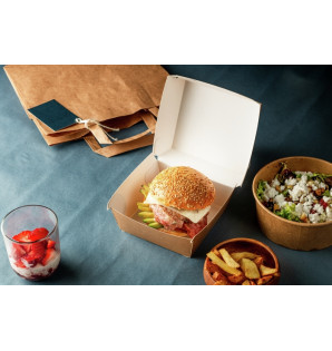 Precio 69,00 € impuestos excl.Unidad : 600BBK12Caja Burger de cartón kraft con revestimiento interior blanco. Esta caja está incluida en nuestra Solución Burger para llevar para 1 persona YFO1. Se fabrica en Francia y es reciclable. -