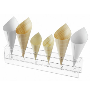 Precio 20,00 € impuestos excl.Unidad : 400CBS125Cucurucho de fina lámina de madera replegada de 125 mm de altura. Puede utilizarse en el horno, microondas y congelador, pero no está adaptado a líquidos. Nuestros expositores UNI son la forma perfecta de mostrar sus productos de forma original. Cucurucho de madera también disponible CBS180 -