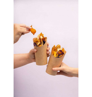 Precio 3,25 € impuestos excl.Unidad : 50PFK48Tarro para wrap de cartón kraft antigrasa multiusos, de gran capacidad: para wraps y también para patatas fritas, churros, nuggets o palitos de verduras. Es reciclable y está disponible en paquetes grandes (1000 unidades) XPFK48 -