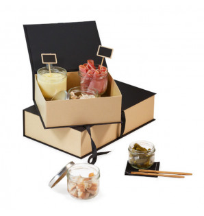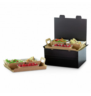 Prix 424,75 € HTConditionnement : 100YFO51 caja Essentiel cartón negro 250x185x alt. 120 mm CEF2 2 manteles individuales con asas cartón kraft 230x180 mm CEF 4 cuencos Cubik 25 cl de cartón kraft/PET 110x110x alt. 40 mm BCN25 2 fuentes Cubik de cartón kraft/PET 130x65x alt. 30 mm AKN6 -