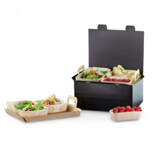 Prix 825,20 € HTConditionnement : 100YFO13Solución para menú para 2, se compone de una caja y un calce de cartón kraft, con 4 cajas Woodbox. Cajas de álamo francés con cajitas de papel/PET, aptas para horno (200 °C) y microondas. Aptas para el contacto directo con alimentos y biodegradables, se fabrican en Francia -