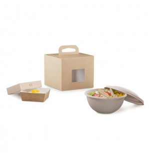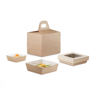 Prix 242,70 € HTConditionnement : 100YFO31 caja Bento de cartón kraft 175x175x alt. 150 mm CBK17 3 barquillas de 1 litro de cartón kraft/celofán 160x160x alt. 50 mm BNK160 -