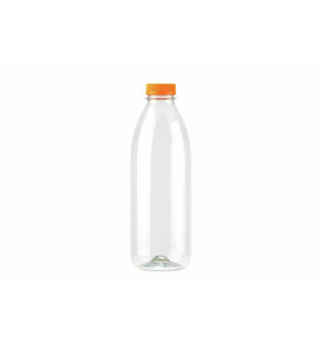 Botella transparente y ligera, con tapón de rosca naranja (envasado por separado, incluido en cada caja). Enroscado en la botella, el tapón queda anclado al cuello y se convierte en inviolable. Permanece unido una vez abierto. Solución adaptada para comida para llevar o entregar. Disponible en 3 tamaños: 25 cl JUS25, 50 cl JUS50 y 100 cl JUS100.