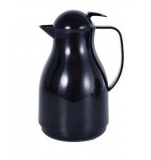 Jarra isotérmica de un litro de PP negro con interior de vidrio estanco. Equipada con un tapón de rosca y un mecanismo de apertura a presión, se puede usar con una sola mano. Para un servicio controlado y constante de líquidos calientes o fríos. Es perfecta para servicios de desayuno en hoteles o restauración móvil.