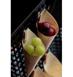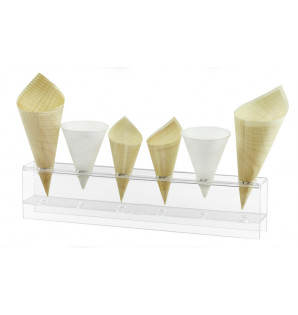 Cucurucho de fina lámina de madera replegada de 125 mm de altura. Puede utilizarse en el horno, microondas y congelador, pero no está adaptado a líquidos. Nuestros expositores UNI son la forma perfecta de mostrar sus productos de forma original. Cucurucho de madera también disponible CBS180