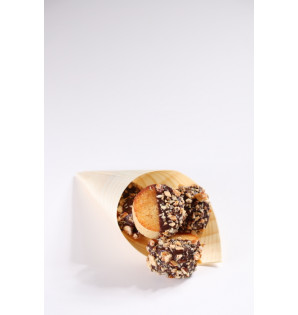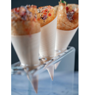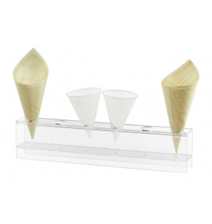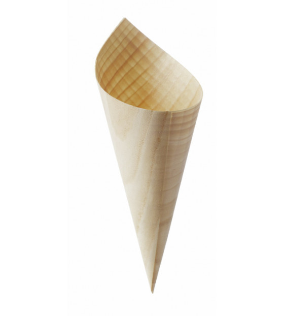 Cucurucho de fina lámina de madera replegada de 180 mm de altura. Puede utilizarse en el horno, microondas o congelador, pero no está adaptado a líquidos. Nuestros expositores UNI son la forma perfecta de mostrar sus productos de forma original. Cucurucho de madera también disponible CBS125