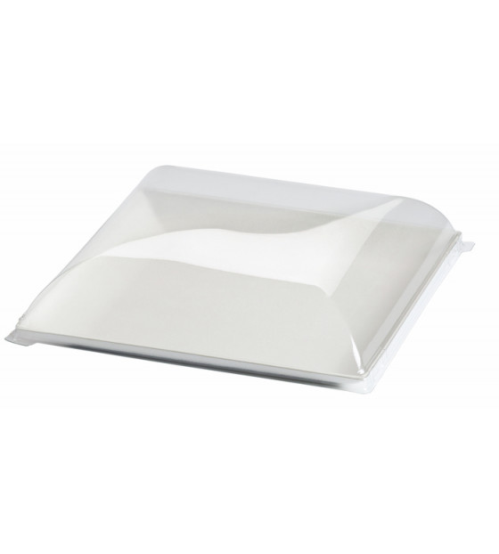 Tapa transparente de rPET (reciclado y reciclable) de 4 cm de altura, adaptada al plato de bagazo cuadrado de la gama Komodo AK180
