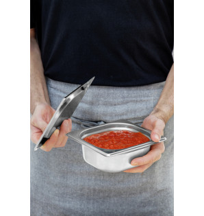 Equipamiento esencial de las cocinas profesionales, los recipientes Gastronorm de acero inoxidable 1/6 le permiten cocinar, almacenar y transportar sus alimentos, presentar sus preparaciones y servirlas fácilmente. En el comedor o en la cocina, son adecuados para preparaciones frías y calientes. Como el acero inoxidable es un perfecto conductor del calor, las bandejas pueden utilizarse en hornos de hasta 250°C, al baño maría para mantener los alimentos calientes, o para conservarlos temporalmente refrigerados. Higiénicas, ligeras, indeformables (bordes reforzados) y fáciles de limpiar, se pueden lavar en el lavavajillas.