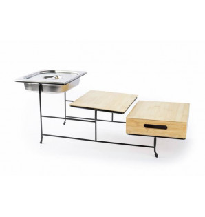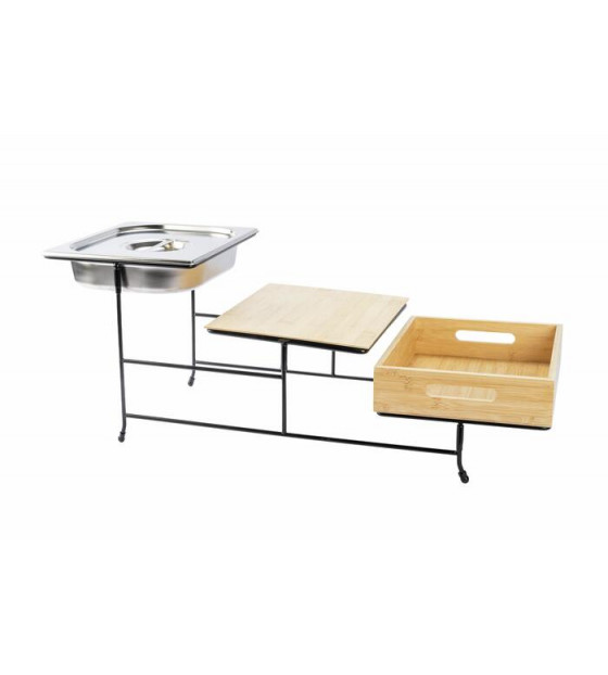 Soporte de metal negro diseñado para exponer tres recipientes o bandejas GN 1/2 simultáneamente. Compatible para una amplia gama de configuraciones: buffets calientes (bandejas de acero inoxidable BGN12H100) o buffets fríos (cesta de PP CORB12, caja de bambú CBGN12).