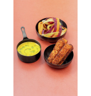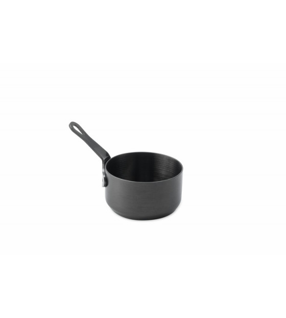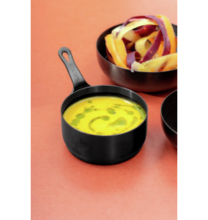 Mini sartén negra de acero inoxidable de 9 cl para una presentación original y única de preparaciones frías o calientes, salsas, mini postres... Puede utilizarse en el horno para calentarse. Es lavable, reutilizable y reciclable. Disponible en 6 cl MPI6
