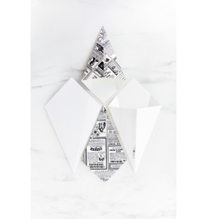 Cucurucho clásico de cartón resistente, disponible en 2 tamaños, blanco CPB215, y con impresión de periódico CPN215. Perfecto para comida para llevar de patatas fritas, churros, caramelos… Se vende plano para optimizar el almacenamiento, y toma forma rápida y fácilmente.