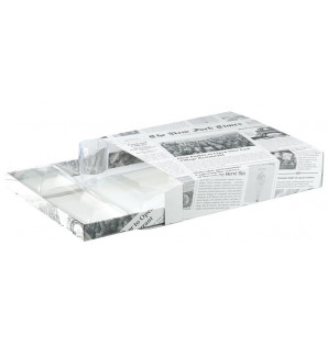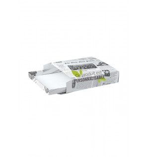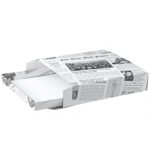 Caja cuadrada multiusos de cartón impreso de tipo papel de periódico. Se compone de una bandeja-cajón (alt. 30 mm) y un estuche, es perfecto para entregar un brunch, una comida o mini pasteles para un evento compartido. Es compatible con todas nuestras gamas de vajillas y barquillas.