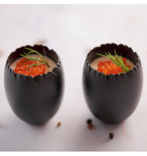 Vasito de PP con forma de cáscara de huevo, ¡perfecto para creaciones culinarias a base de huevo! Su diseño con superficie plana permite presentarlo con estabilidad. Producto apto para la congelación y el microondas. Lavable, reutilizable y reciclable al final de su vida útil. La gama Oveo está disponible: