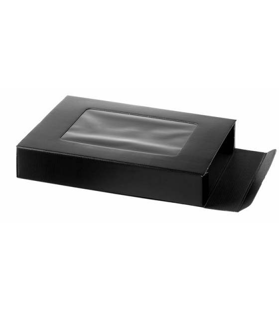 Estuche de cartón negro con ventana transparente de PVC (250x165 mm), para el transporte seguro de bandejas de formato Atlas 1/1. Se adapta especialmente bien a la gama Caterlux PCL15C, PCLD15
