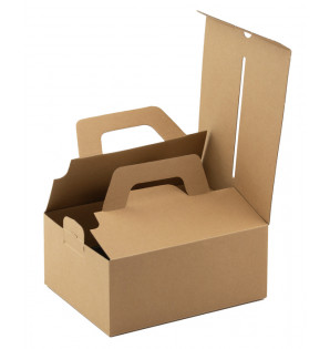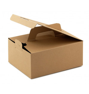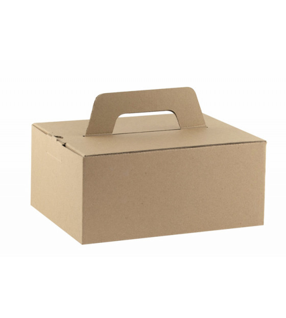 Caja de cartón kraft resistente y práctica con apertura superior. Con asa abatible, se puede apilar. Esto significa que puede preparar y almacenar sus soluciones de menús de comida para llevar con antelación. Producto que se entrega plano, fácil de montar gracias a su fondo automático.