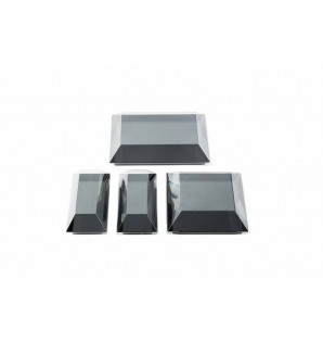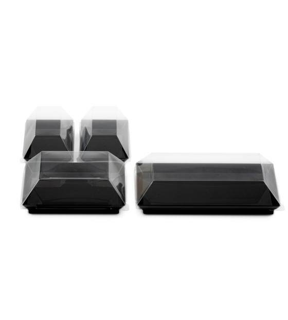 Kit de vajilla Cubik de PS negro con tapas de rPET (alt. 30 mm), se compone de: - 1 plato 180x130 mm ACU18N y tapa ACC18 - 1 plato 130x130 mm ACU13N y tapa ACC13 - 2 fuentes 130x65 mm ACM65N y tapa ACC6 Este kit versión A adaptado a nuestras bandejas para comida Thema, también está disponible en PP apto para microondas KITMO y en PS transparente KITVA