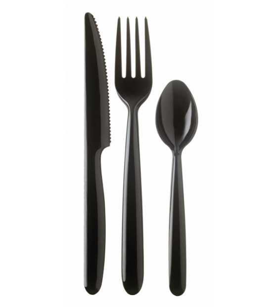 Kit de cubiertos Luxor de PS negro de alta calidad, se compone de un tenedor, un cuchillo, una cuchara y una servilleta. Con su diseño contemporáneo, estos cubiertos son agradables de usar, lavables y reutilizables. La gama Luxor está disponible en 4 kits: - en negro brillante, kits 4/1 y 6/1 KL41N y KL61N - en transparente, kits 4/1 y 6/1 KL41C y KL61C