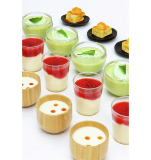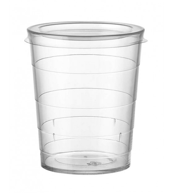 Vasito de 6 cl, con diseño transparente y cuatro rayas horizontales. De PS, es reutilizable y reciclable. Puede cerrarse con una tapa para facilitar su almacenamiento y transporte C2M45. Disponible en paquetes pequeños (300 u.) MIG60C