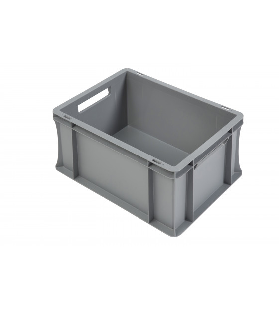 Contenedor Euronorm de 20 litros, de polipropileno gris, muy robusto y reutilizable.