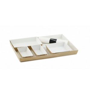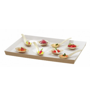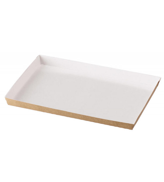 Bandeja formato Atlas 1/1 de cartón kraft ligero, con revestimiento interior blanco de PET para que sea antigrasa. Producto apto para microondas, horno y congelador. Se cierra con la tapa transparente PACV1. Reciclable. La bandeja también está disponible en formato Atlas 1/2 PAN12CT
