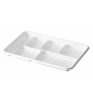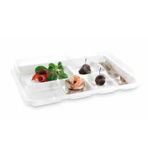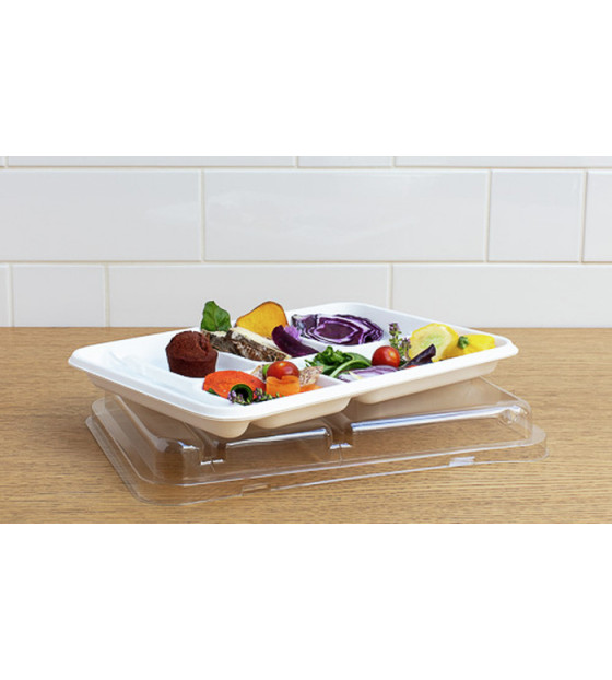 Bandeja para comida de bagazo con 6 huecos, incluido 1 hueco lateral para cubiertos, vaso o accesorios. Puede completarse con una tapa transparente reciclable CPF6R, para una perfecta visibilidad de su contenido. La base se puede meter en el congelador, el horno o el microondas. Bandeja Snack 6 es una solución económica para el reparto de comidas (colectividades, escuelas, empresas…).
