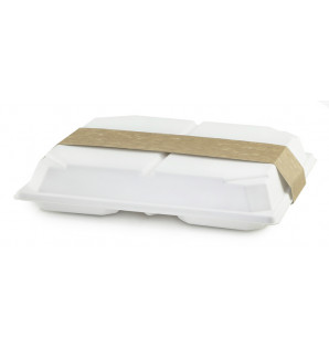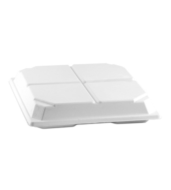 Tapa de bagazo adaptada a la bandeja para comida Quadra del mismo material QF310. Para garantizar la seguridad durante el transporte, se puede añadir un anillo de kraft BQK9, cuyo color contrastará con el conjunto blanco.