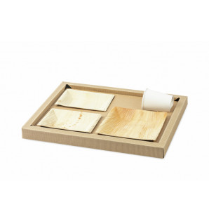 Plato natural rectangular, de vaina de hoja de palma. Puede utilizarse en horno y microondas. La gama Palma está disponible en diferentes formatos: - APA17: 170 x 120 x 25 mm - APA18: 180 x 180 x 25 mm - APA24: 240 x 160 x 25 mm También disponible en kit de vajilla en las bandejas para comida Biodine BK4A, BK4AN, BK3B y BK3BN